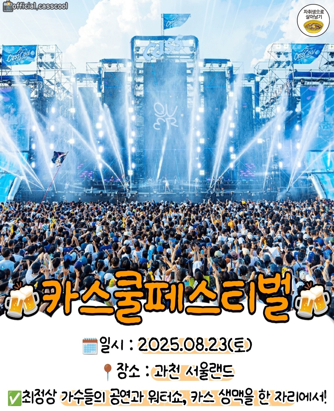 국민맥주 카스가 서울 도심을 통째로 물들이는 브랜드 페스티벌! ‘쿨존’에서는 영하 1 ℃ 엑스트라쿨 카스를 무제한 시음하고, SNS 라이브 스튜디오·포토 모자이크 등 참여형 이벤트가 가득합니다. 아이돌·힙합·DJ 콜라보 무대가 밤새 이어지고, 스프레이 쿨링 터널·미스트 비어 쇼가 한여름 더위를 순삭! 현장 인증샷 업로드 시 한정판 굿즈 교환까지, MZ 세대라면 놓칠 수 없죠.
