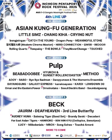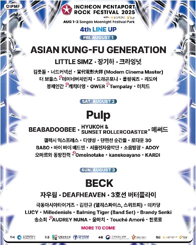 2025 인천 펜타포트 락 페스티벌은 8월 1일부터 3일까지 인천 송도 달빛축제공원에서 열리며, 아시안 쿵푸 제너레이션, 펄프, BECK 등 국내외 최정상급 아티스트가 출연합니다. 티켓은 1일권 12만원, 2일권 18만원, 3일권 24만원이며, 예매는 인터파크 등에서 가능합니다. 올해는 20주년 기념으로 더욱 풍성한 무대와 프로그램이 준비되어 있습니다.